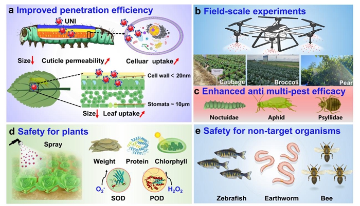 科研团队利用离子液体,在完全水基化体系中制备了单分子纳米农药,并系统阐明了载体药物的自组装机制及关键相互作用力,为难溶性农药的水基化单分子分散改造提供了全新思路和技术路径。该系统显著增强了昆虫表皮转运和植物渗透能力,改善了农药对靶标生物活性,提升了多靶标害虫的田间防效。单分子纳米农药体系为难溶性农药提供了一个完全水基化易于生产制备的平台,为我国农业绿色可持续发展提供新思路。