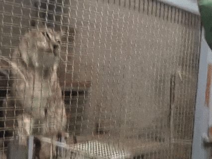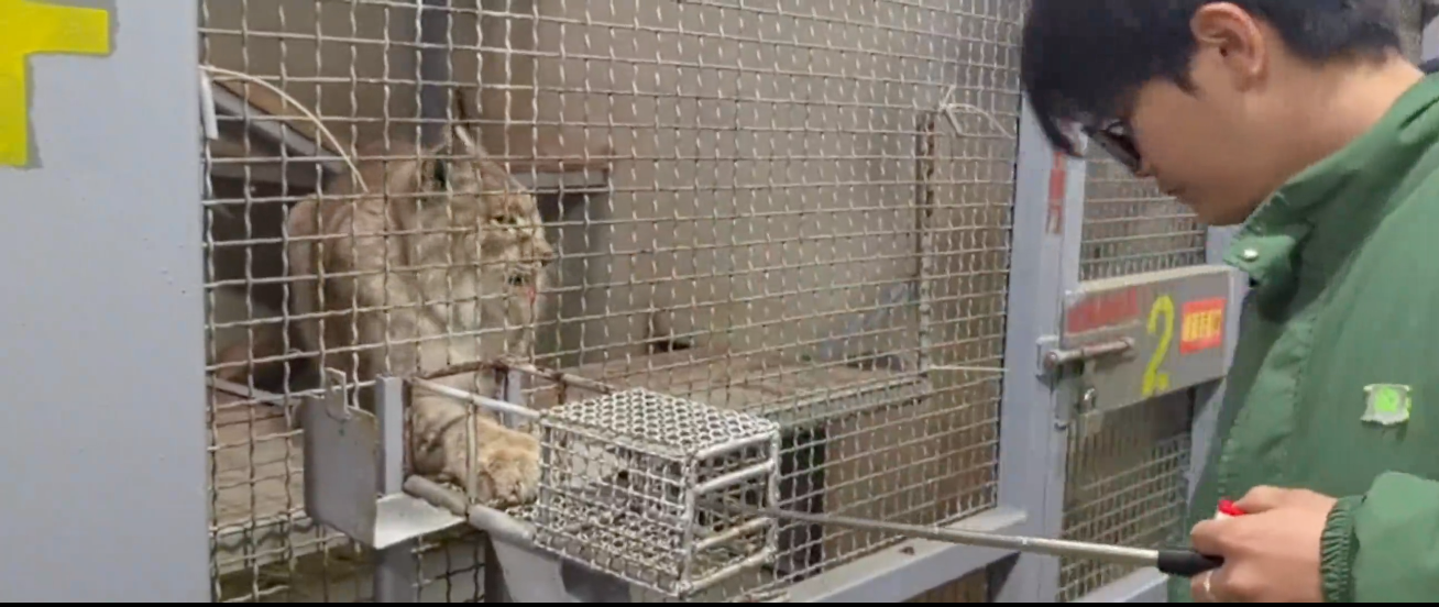 行为训练的第一步是爪定位。饲养员手持目标棒,随后将目标棒伸入网内,当Kitty的爪子触碰或捕捉到目标棒时,立即以响片声和食物进行正强化。作为“优等生”的Kitty,这一步骤很早就掌握了。