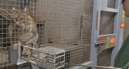 饲养员开始将目标棒不断地定在采血架窗口那,引导Kitty把右前爪伸出来,并搭在目标棒上,完成动作后立即给予食物与响片奖励,通过之前已经熟练的“手定位”训练不断引导,让她理解“伸爪”与“奖励”的关联,逐步延长前肢伸出的长度。
