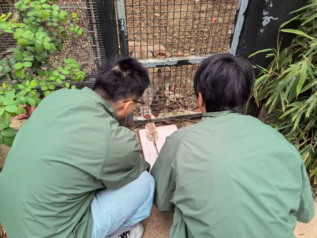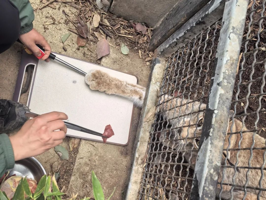 考虑到X光检查对无金属环境的要求,饲养员重新选择了外场门框下一处宽敞区域作为操作点。为让Kitty在伸爪时保持舒适自然的姿势,饲养员特意将地面下挖形成浅坑,深度恰好适配她的趴卧高度,既方便前肢充分伸展,也提升了停留时的稳定性。