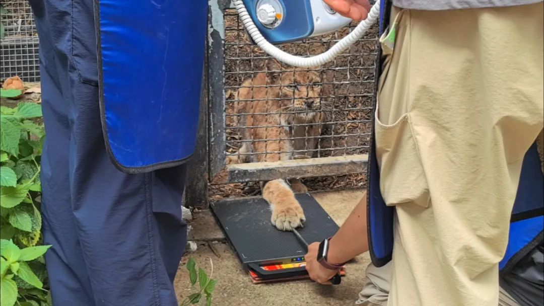 在此期间,饲养员与兽医也持续保持沟通,饲养员不断与兽医确认前肢伸出的长度、角度是否符合检查需求,同时让Kitty在与兽医的接触中逐渐脱敏,降低对兽医的警惕。
