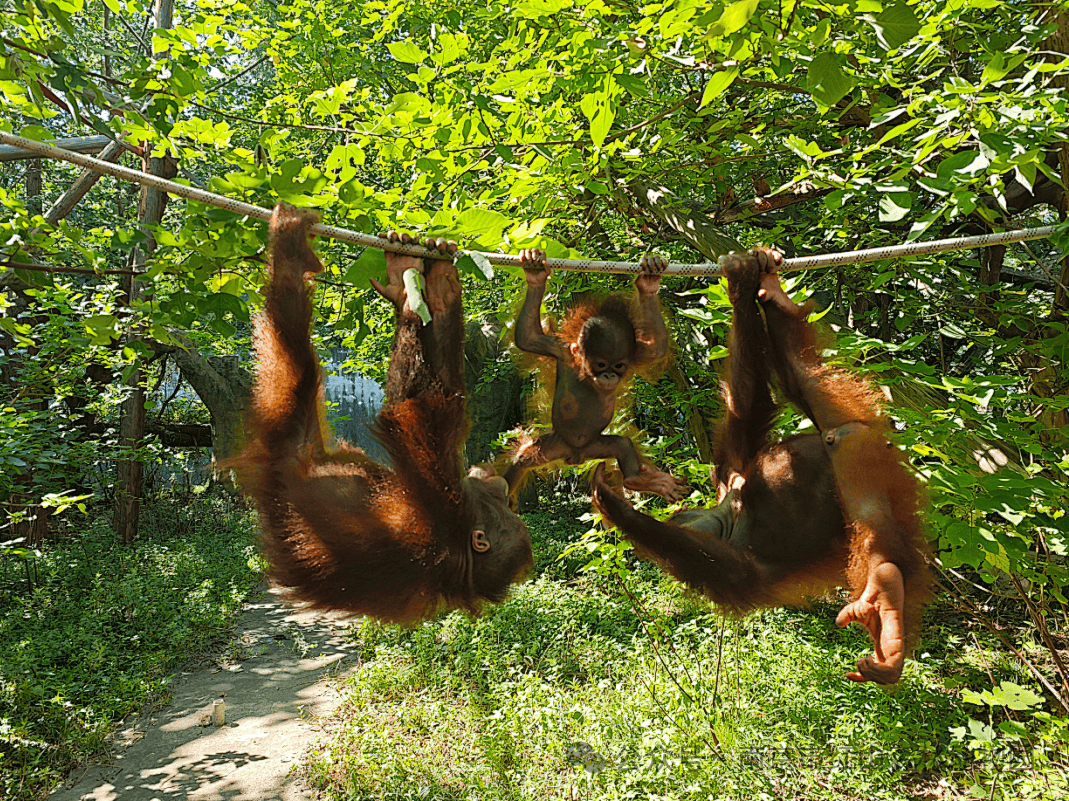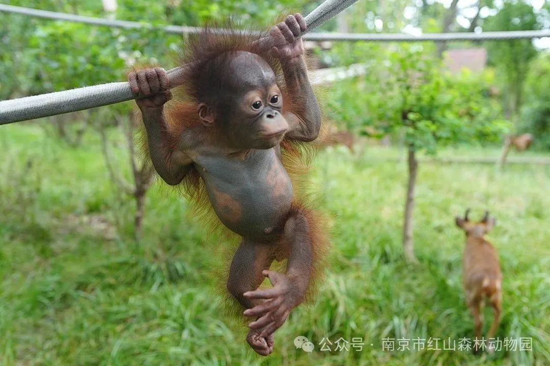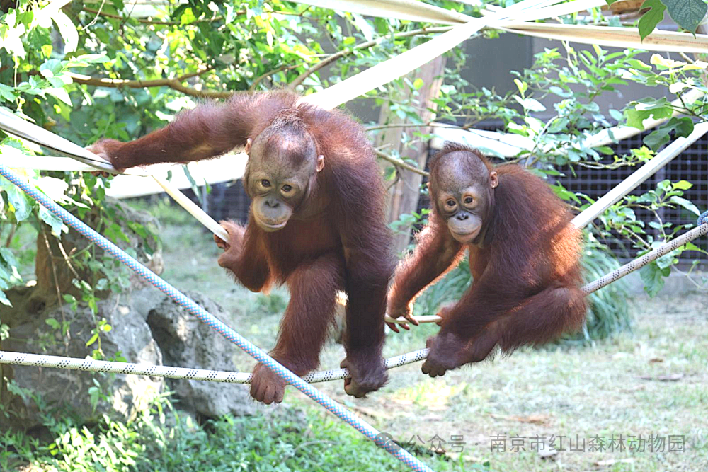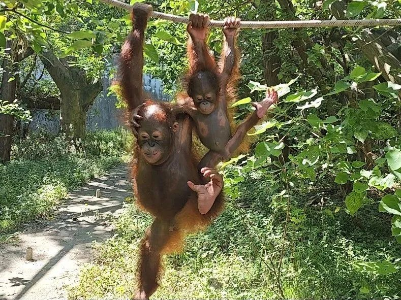 不过第二次见面就不一样啦。毛阿妹对两位哥哥的反应明显缓和,已能在悬挂绳上与他们共同做出抓握、晃动等动作。
