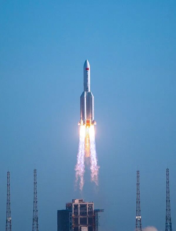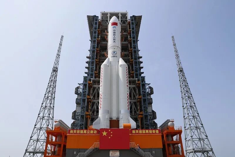 4月23日,空间站天和核心舱与长征五号B遥二运载火箭组合体已转运至发射区。新华社发(郭文彬 摄)