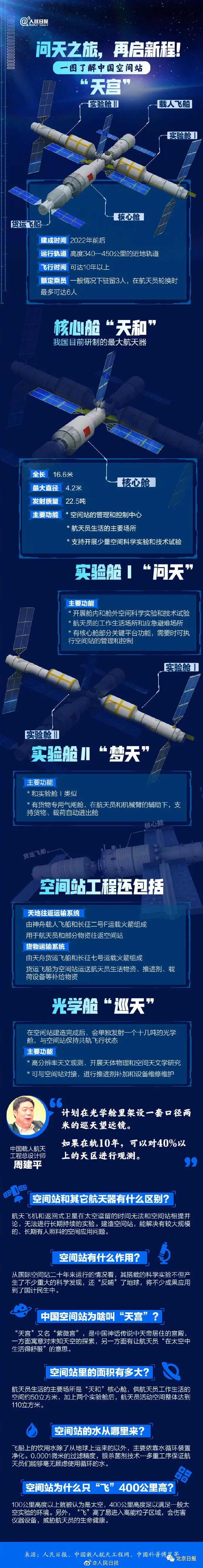 航天科技集团五院空间站任务总指挥王翔介绍,空间站是一种在近地轨道长时间运行、可满足航天员长期在轨生活、工作以及地面航天员寻访的载人航天器,代表了当今航天领域最全面、最复杂、最先进、最综合的科学技术成果。
