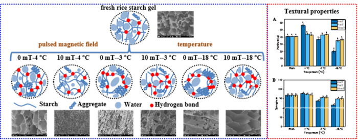该研究通过用不同强度的脉冲磁场分别处理冷藏和冷冻条件下的大米淀粉凝胶,发现脉冲磁场一方面能够弱化水分子网络的空间位阻效应,降低淀粉分子间的氢键作用,从而延缓淀粉老化。另一方面,它可以减轻冰晶对凝胶结构的机械损伤,抑制淀粉分子聚集,同时增强淀粉与水分子间的氢键作用,显著提升冻融稳定性。该研究有望广泛应用于淀粉基食品的保鲜工艺中,进一步提升食品品质并延长货架期。