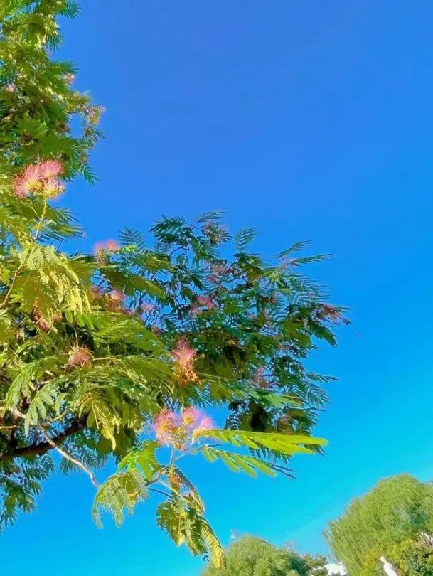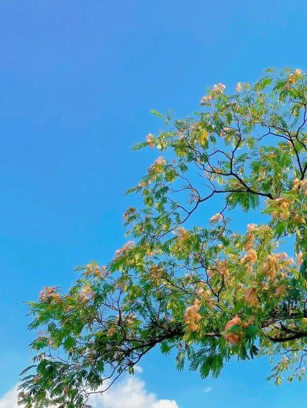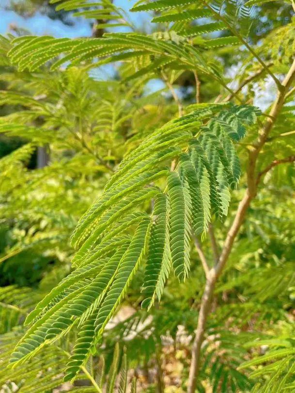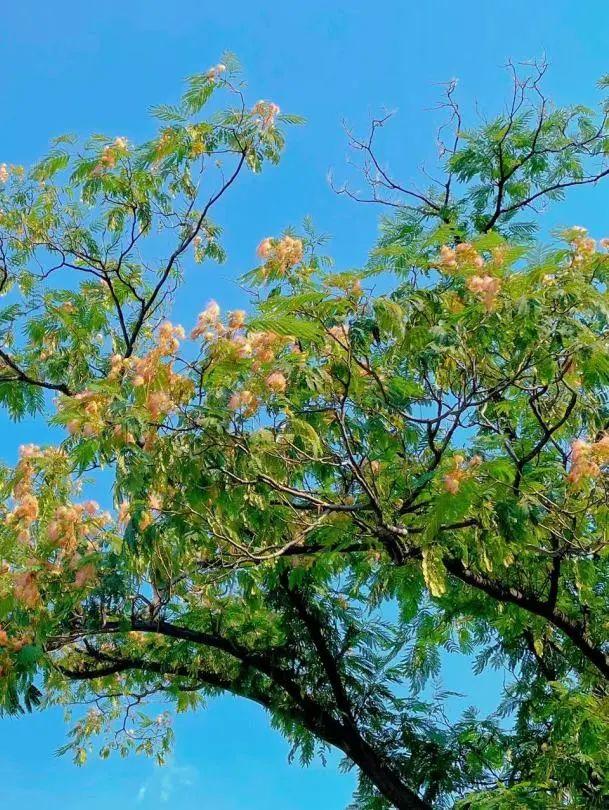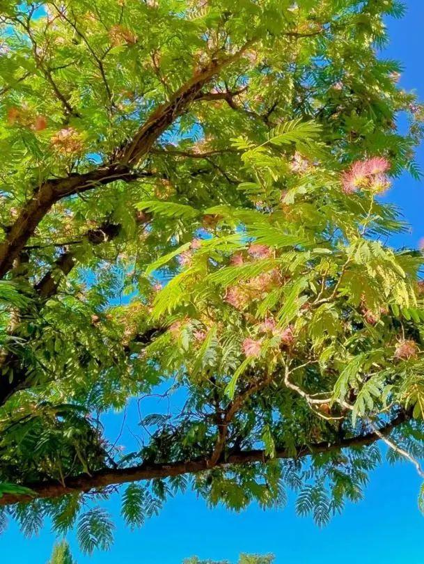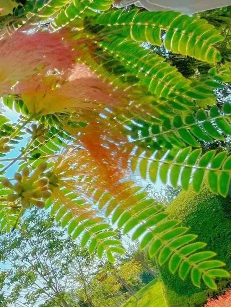 合欢树的叶片是羽状复叶,有着昼开夜合的功能,所以,合欢花又被称为“夜合花”。