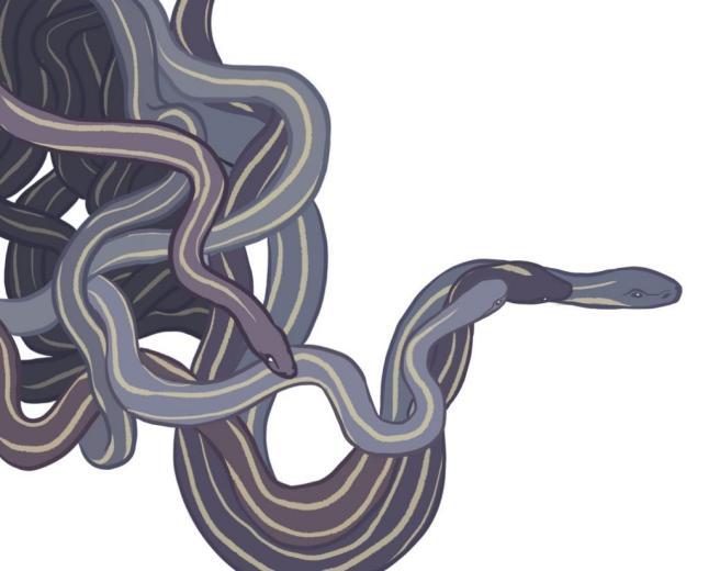 红边束带蛇常栖息于近水的寒冷地带,他们演化出了一种独特的生存策略。为了度过漫长的寒冬,红边束带蛇会在地下蛰伏长达九个月。等到春天来临,万物复苏,公蛇纷纷从地下钻出,形成壮观的“蛇海”。它们聚集不仅可以吸引母蛇的注意,还能够通过这种聚集行为迅速恢复体温、提升生存概率。公蛇们会释放一种信息素,该物质会让其他公蛇误判其为母蛇,从而吸引众多公蛇紧贴在自己身上,由此呈现出奇特的 “伪雌” 现象。这种生存策略被称为 “窃取热能”(Kleptothermy)。