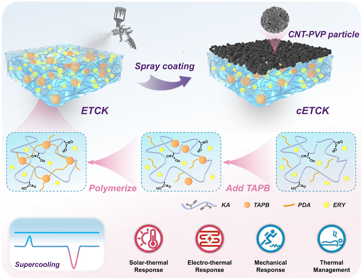 近日,中国科学院大连化学物理研究所研究员史全和副研究员寇艳团队开发出一种基于赤藓糖醇的多能响应柔性时空相变材料膜(cETCK)。该时空相变材料膜不仅可实现赤藓糖醇相变潜热在过冷状态下的长期存储与可控释放,还具备良好的柔韧性、机械性和多重能量响应特性,在可穿戴热管理领域展现出良好的应用潜力。相关成果发表在《化学工程杂志》。