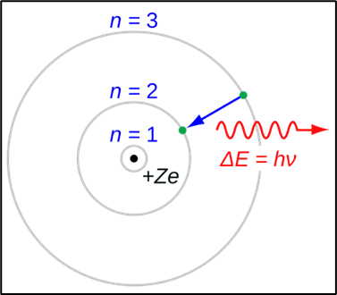 原子能级示意图。这里的n代表着它的层数,绿色的点代表一个从第三层跳回到第二层的电子 来源:维基百科