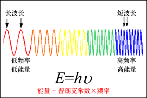 光的能量、频率与颜色之间的关系。能量越低,频率越低,颜色越红;能量越高,频率越高,颜色越蓝。如果能量比红色更低或比蓝色更高,发出的光人眼就不可见了。
