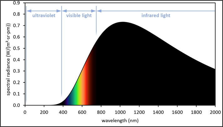 白炽灯光谱。有用的可见光只占左边的一小部分,而右边巨大的黑色山峰代表着,大部分能量都在不可见的红外区域,化作热辐射耗散掉了。 来源:Christopher S. Baird