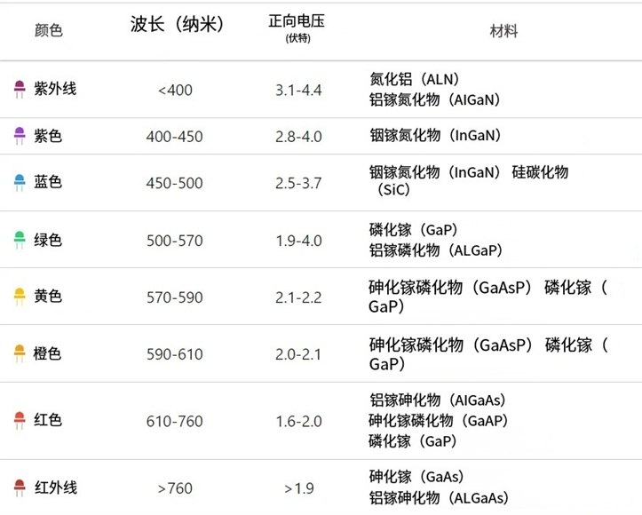 不同颜色的LED与对应的不同化学成分 来源:MyElectricSparks