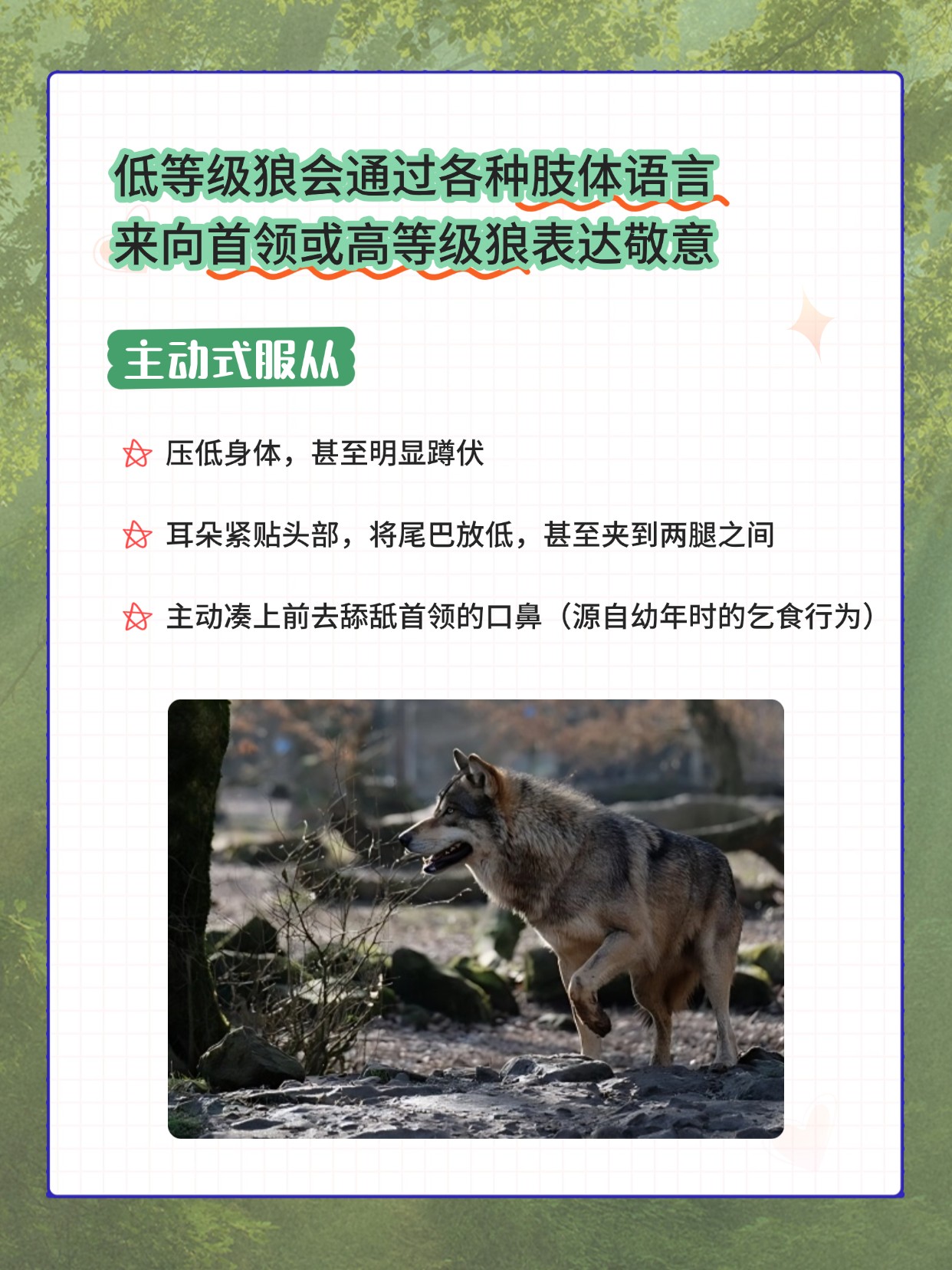🐺 狼群是个等级森严的大家族。对于首领,其他成员必须时刻表现出明显的服从。为了避免内耗,它们拥有一套精密的“服从礼仪”来确认和巩固首领的地位,低等级成员会通过各种肢体语言来表达敬意。