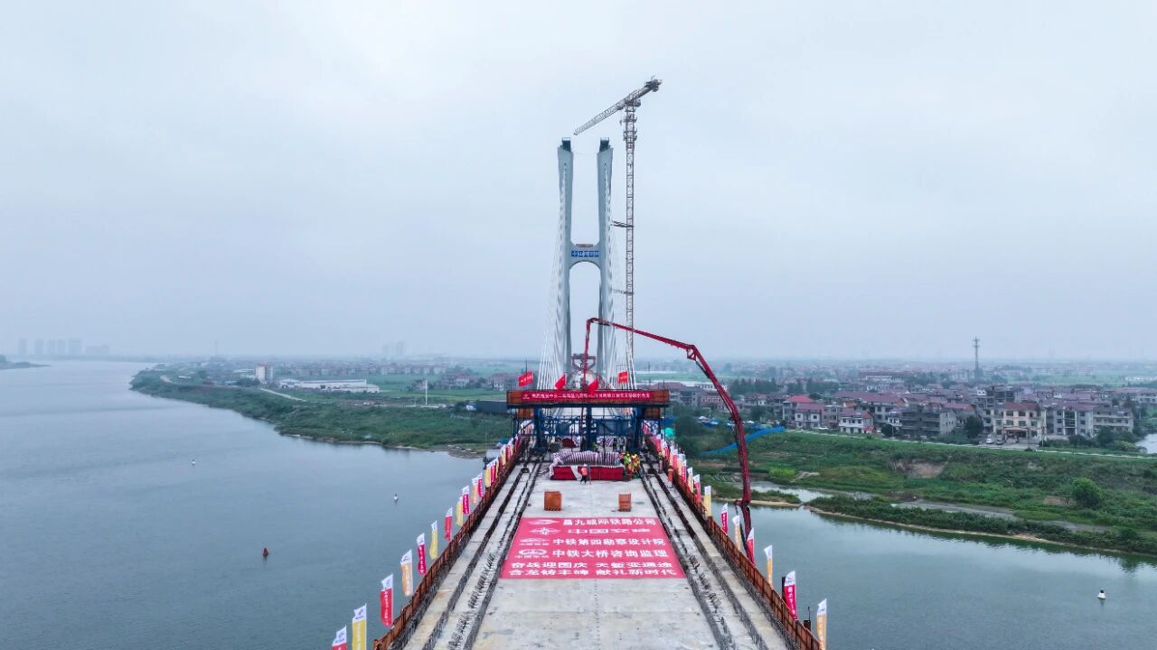 此次合龙的昌九高铁南昌扬子洲赣江公铁大桥跨赣江南支主桥为混凝土独塔斜拉桥,全长510米,主跨240米,塔高108米,呈花瓶造型,是目前世界跨度最大的设计时速350公里独塔混凝土斜拉桥。