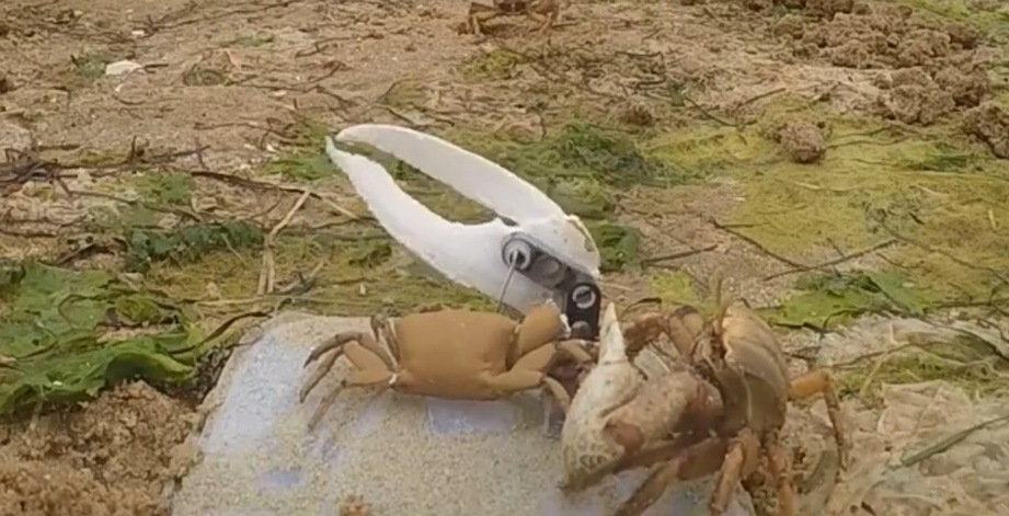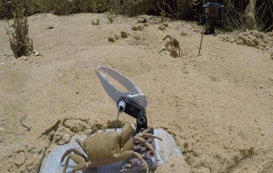 来自英国埃克塞特大学动物行为研究中心(CRAB)的研究人员将这种想法变成了现实。他们将一只机器螃蟹,派入了正处于繁殖季的真实招潮蟹社群中,最终招致雄蟹的轮番攻击,以至于机器螃蟹被卸掉了一只“胳膊”……