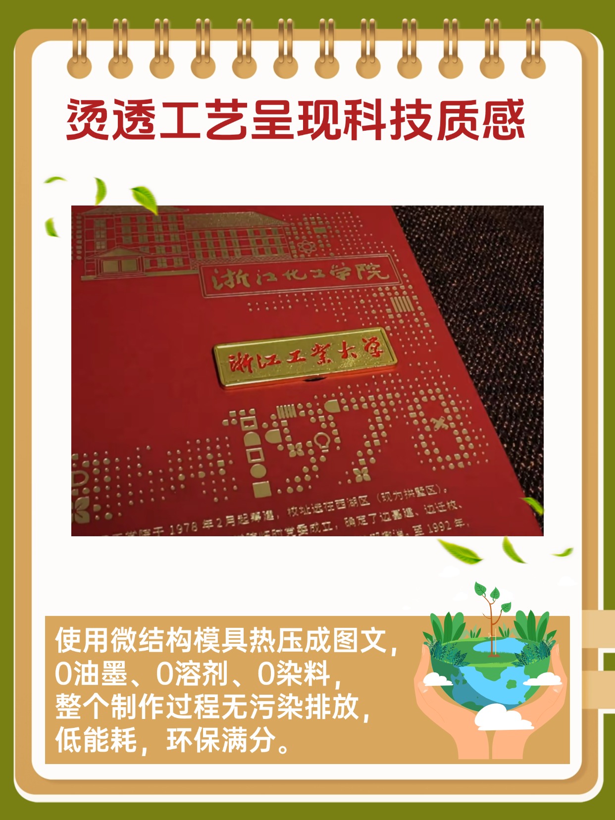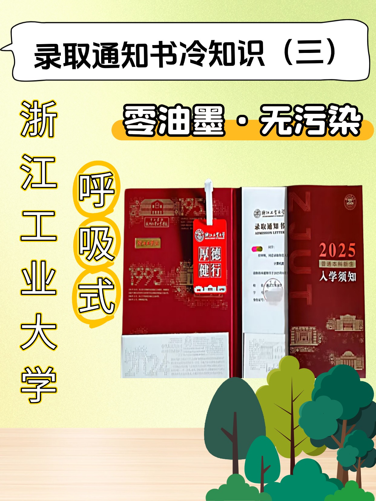 没错!这不仅是一张纸,更像是一件带温度的艺术品:浙工大今年的新生通知书采用「烫透工艺」+「微结构模具热压」,0油墨、0溶剂、0染料,从制作到成品全无污染残留,低能耗、超环保,简直就是“地球友好型”通知书!