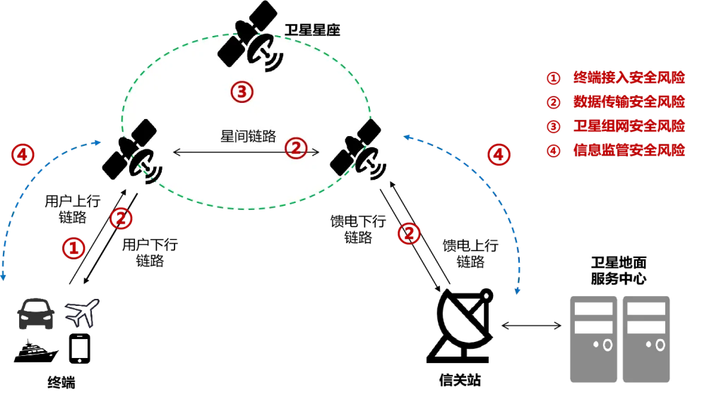 一是数据出境风险。卫星互联网系统具有天然的跨境覆盖和全球通信的特性,数据通过卫星可以中继到任意信关站,存在数据出境的风险。同样,境内的或者边境的不法分子也可借助卫星通信终端将不可出境的机密数据通过轨道上的卫星星座,将数据传输到境外。