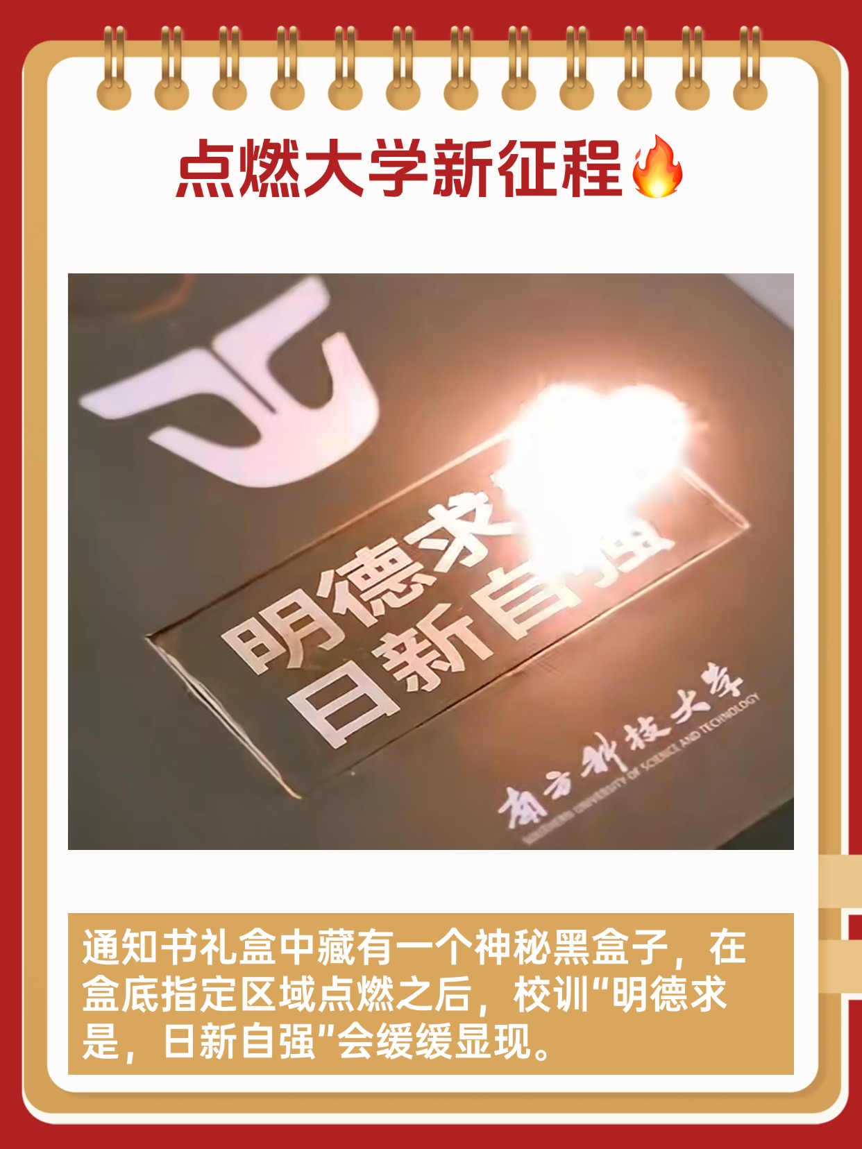 🔥你见过点燃瞬间就能唤醒校训的录取通知书吗?南方科技大学这份 “燃” 式通知书,将黑科技的酷炫与传统文化的厚重揉成一簇 “火焰”—— 当火星触碰纸页,校训在光影中缓缓浮现,仿佛下一秒就要开启一场 “以知识为火” 的探索之旅,让 “成为南科大人” 的开始,就充满热血仪式感。