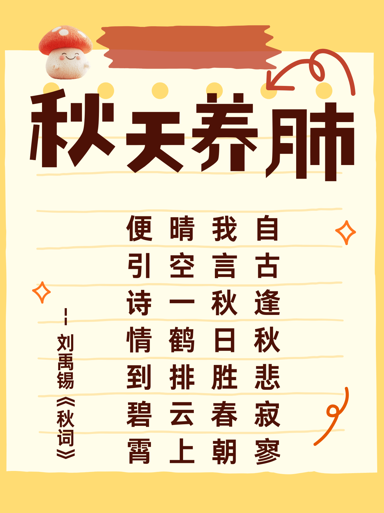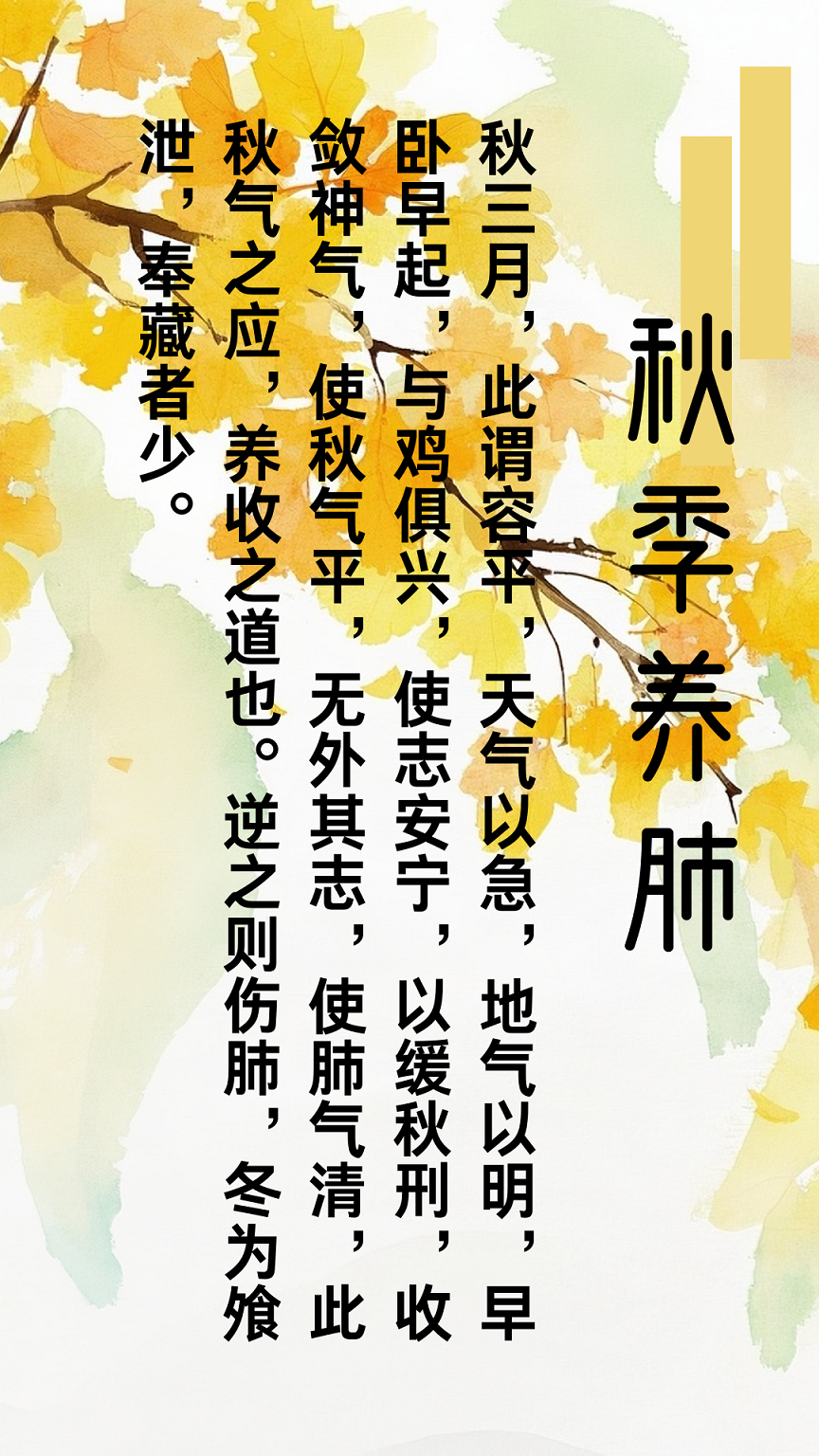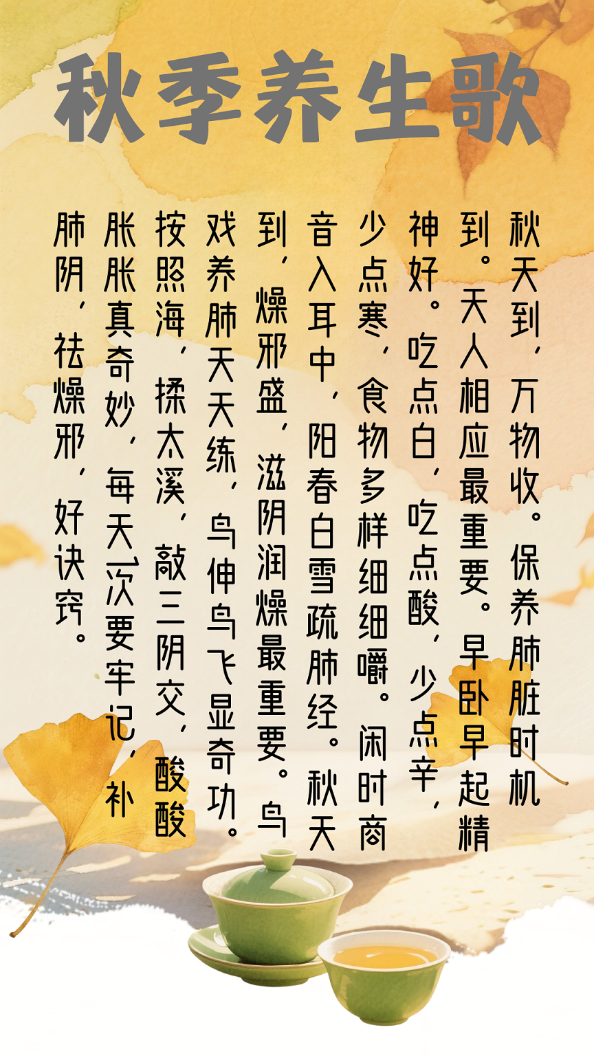 秋天到,万物收。保养肺脏时机到。天人相应最重要。早卧早起精神好。吃点白,吃点酸,少点辛,少点寒,食物多样细细嚼。闲时商音入耳中,阳春白雪疏肺经。秋天到,燥邪盛,滋阴润燥最重要。鸟戏养肺天天练,鸟伸鸟飞显奇功。按照海,揉太溪,敲三阴交,酸酸胀胀真奇妙,每天1次要牢记,补肺阴,祛燥邪,好诀窍。