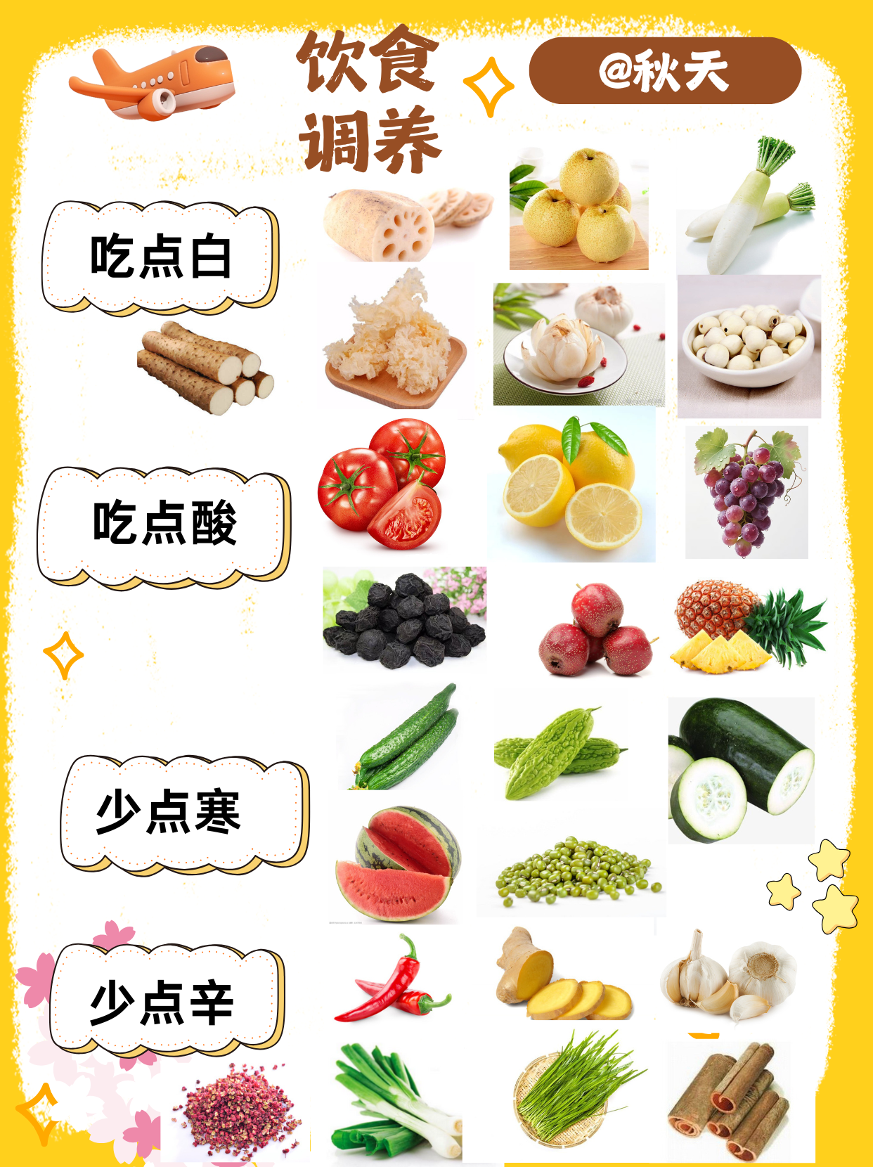 在秋天,饮食上通过“吃点白”“吃点酸”“少点寒”“少点辛”,以润肺生津、养阴清燥。