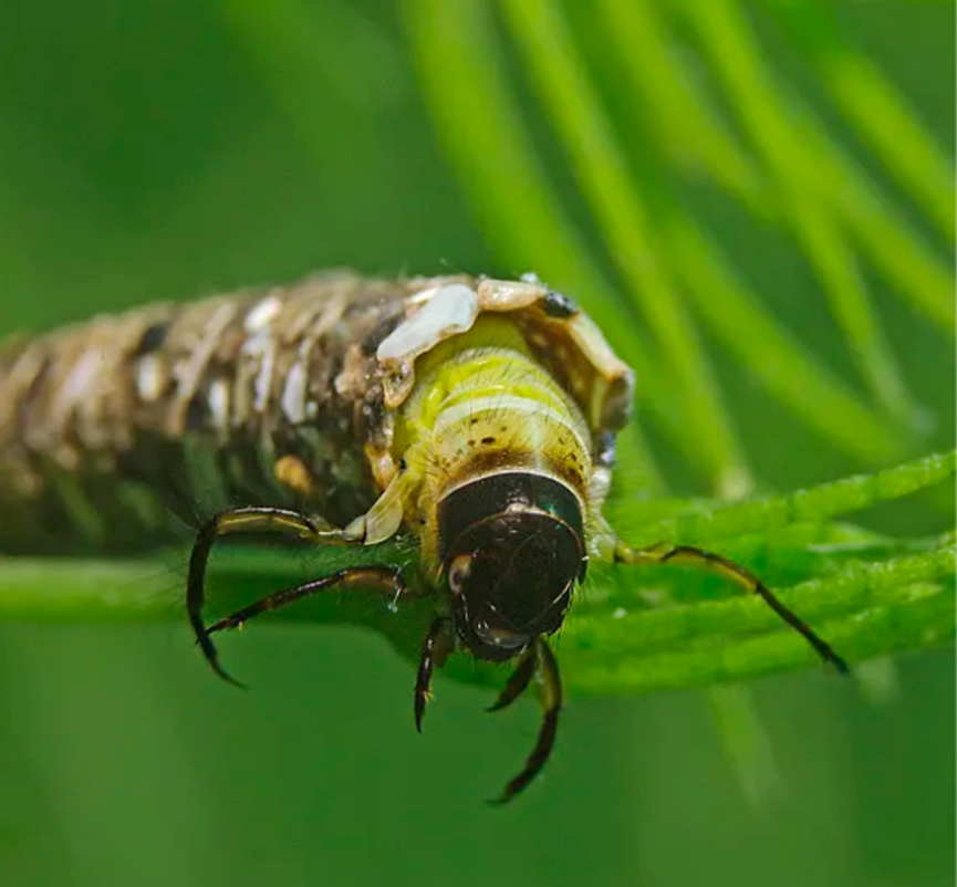 两三周后,蛹壳裂开,一只湿漉漉的新生成虫挣扎着爬出来。它像刚晒好的衣服一样挂在树枝上,耐心等待翅膀慢慢舒展硬化。