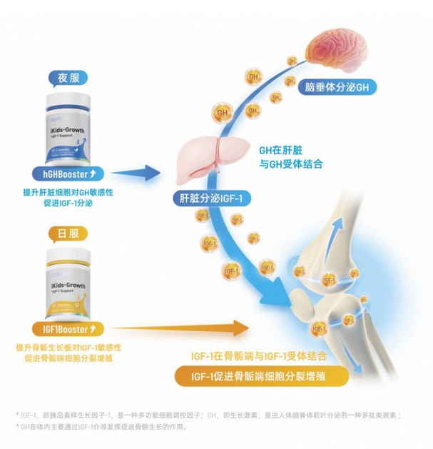 简单来说,可归纳为:垂体分泌生长激素(GH)→肝脏合成IGF-1→IGF-1促进骨骼生长板生长。