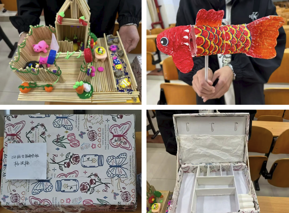 在旧物改造作品提交环节,参赛人员带来各具特色的作品,既有利用废旧纸箱制作的创意笔筒,也有用一次性筷子改造的微观小屋。这些作品不仅外观精美,更蕴含着“变废为宝”的巧思,充分展现同学们的环保意识与动手能力。