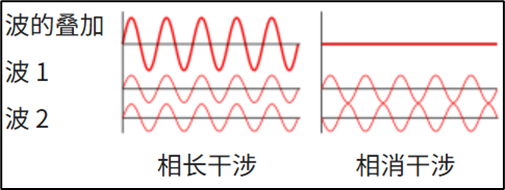 波的干涉原理示意图。左图:当两个波完全重叠,叠加出更强的波,对应干涉条纹中的亮条纹;右图:当两个波发生交错,波的强度被抵消了,对应干涉条纹中的暗条纹。 来源:维基百科