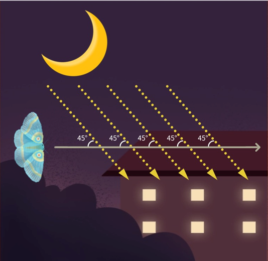 为了防止在迁徙途中迷失方向,飞蛾利用这一特性,发展出了一套高级的导航系统——“光罗盘定向”。它们通过保持与平行光形成特定角度的飞行方向,实现了直线飞行,有效节约了能量。这套系统在自然环境下极大地帮助了昆虫判断飞行方向。