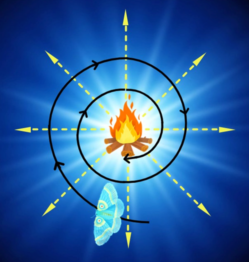 环境中的点光源,如自然界的火源和人造光源,其光线是朝四面八方辐射发散的。当飞蛾面对火源或灯泡这样的点光源时,如果继续按照与光线特定角度飞行,就会陷入一个螺旋下降的轨迹,离火越来越近,最终不幸葬身火海。