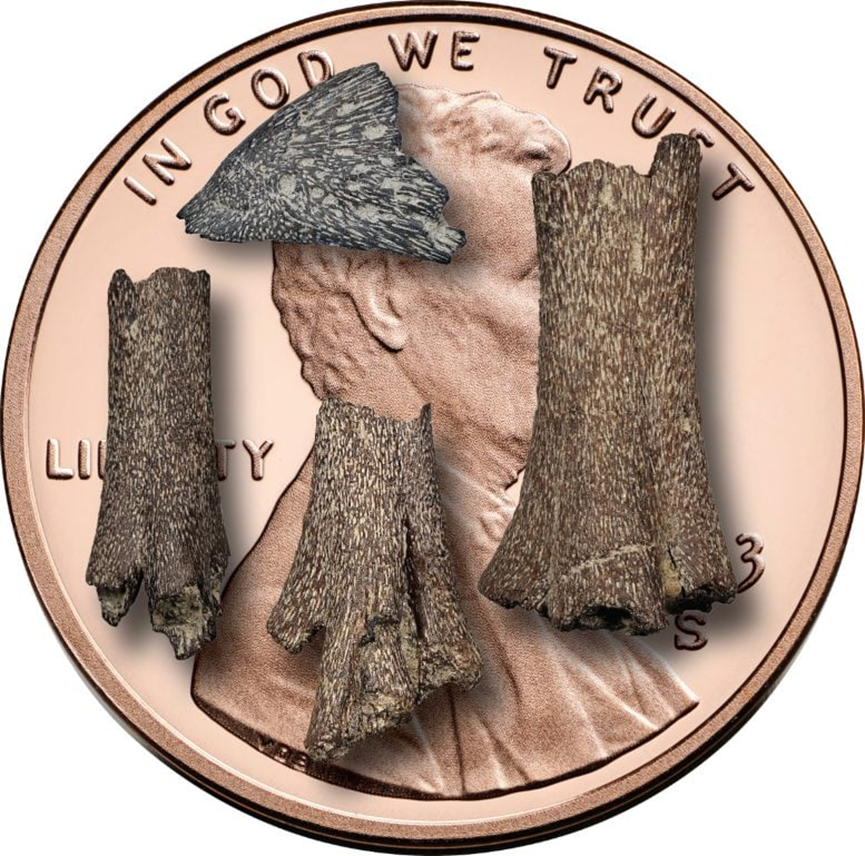 一便士硬币上,对比展示着一只幼鸟的喙尖和三根脚趾骨。骨骼特有的海绵状结构,正是它们属于幼鸟而非成鸟的关键证据。(图片来源:阿拉斯加大学北方博物馆)