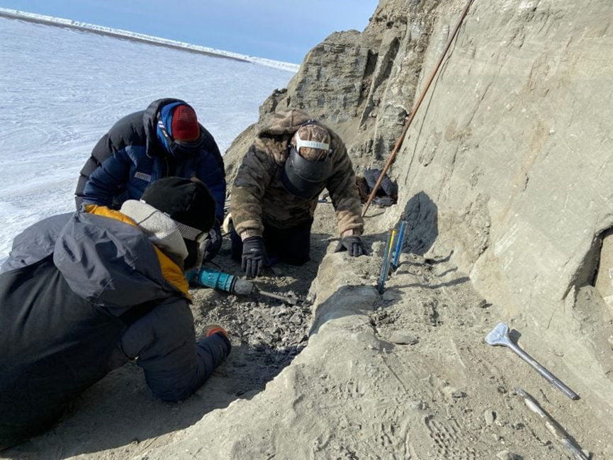 科学家们在科尔维尔河(Colville River)上的微化石遗址雅各布床(Jacob's Bed)进行挖掘,寻找小骨头和牙齿。(图片来源:阿拉斯加大学北方博物馆)
