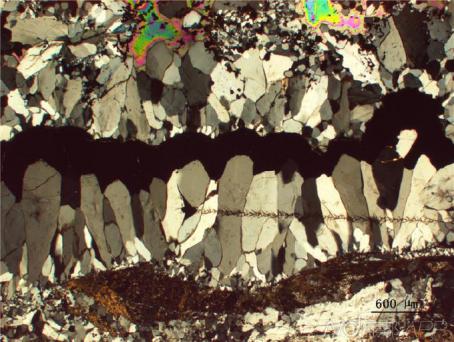 显微镜下的微米级的沥青铀矿切片,上下锯齿状的是岩石晶体