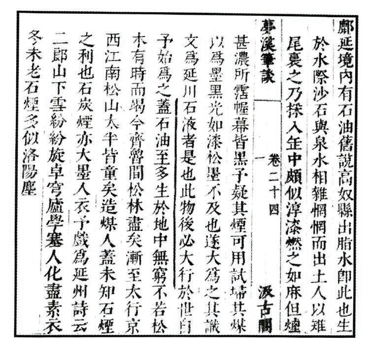 在我国古代,石油的名称随着人们对石油认识的深化而不断演变。最初,人们把石油看成是可以燃烧的水或肥水。随着人们对石油的物理特性、功用、区域分布等有了进一步了解,之后,石油又被称为“石漆”“膏油”“沥青”“石脂”“肥”“可燃水”等。隋唐到北宋时期,出现了“石脂水”“猛火油”“火油”“石脑油”等称呼[4]。“石油”这一名称始于北宋学者沈括在《梦溪笔谈》中的记载:“鄜、延境内有石油,旧说‘高奴县出脂水’,即此也……此物后必大行于世,自余始为之。”[5](图2)沈括详细考察了延川一带劳动人民采集、利用石油的情况,不仅给出了石油的命名和定义,结束了此前命名混乱的局面,还对石油的未来提出了极具前瞻性的预言。之后,“石油”这一名称一直沿用至今,且成了通用名称。