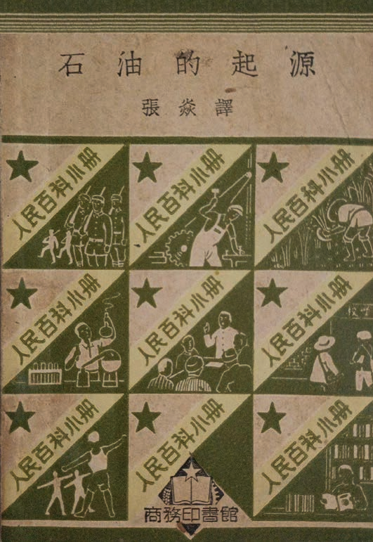 苏联是世界上最早大规模开采石油的国家之一,积累了大量的理论技术知识和经验,也出版了大量的石油科普着作。在苏联对中国的工业化社会建设进行援助的时期,我国大量从苏联引进石油类书籍,这一时期的石油科普也被打上了深深的苏联印记。《石油》(燃料工业出版社1951年版)、《石油的起源》(商务印书馆1951年版,隶属于“人民百科小册”,图10)、《苏联石油工作者的贡献》(燃料工业出版社1952年版)、《古勃金院士与石油地质学》(中国科学院1954年版)、《石油炼制过程及设备》(燃料工业出版社1954年版)、《石油与天然气产地电法勘探》(地质出版社1955年版)等分别由张焱、谢家荣、周家馏等人译自苏联。在引进苏联科普著作的过程中,国内出版社积极性高涨,有些作品甚至出现了一书两译现象,并由不同出版社分别出版。例如前述张焱所译的《石油》,也被舒山同时译作《黑色的金子——石油》(开明书店1951年版),作为“苏联青年科学丛书”的分册;再如刘安义翻译的《石油的故事》(中国青年出版社1957年版)为“青年科学丛书”的分册,而许毅复也翻译了此书,并由石油工业出版社于1958年出版。