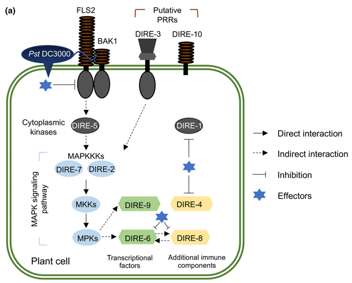 该研究以丁香假单胞菌多聚突变体D36E与本氏烟草为模式,系统研究了13个核心效应蛋白介导的植物转录组,鉴定出多个D36E激发且受核心效应蛋白组抑制的基因,该类基因对不同菌株来源的效应蛋白均表现出广谱免疫应答能力,其中10个关键基因形成了由跨膜受体、胞内信号因子等组成的一条全新的保守免疫信号途径。该研究为作物抗病设计提供了全新数据信息和作用靶标。