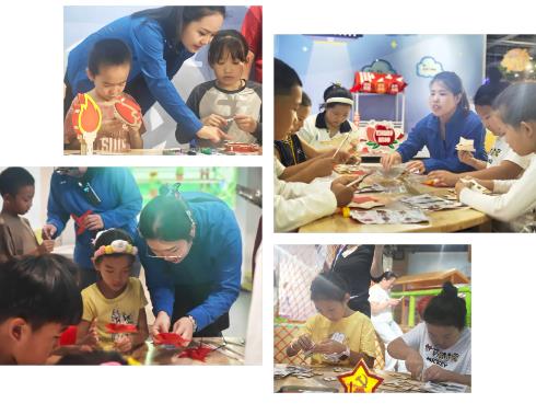 展厅一角活动中,小朋友们跟随科技辅导员一起制作“国旗风车”,风车迎风转动,象征着祖国事业欣欣向荣,永不停歇。“手持火炬”及“爱国星”等活动更是获得了小朋友们青睐,他们亲手制作出闪亮的火炬和星星,寓意着爱国精神永远激励着新一代勇往直前。