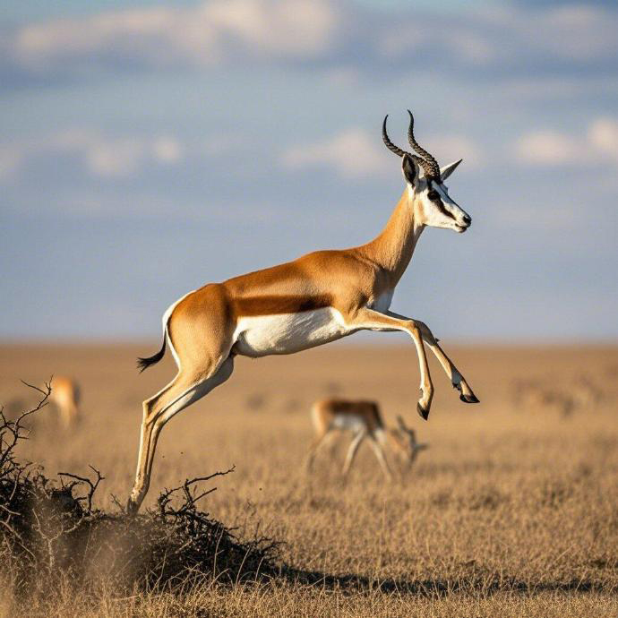 跳羚极其擅长跳跃,堪称非洲草原的“弹跳精灵”,没事就爱跳高高。起跳时其脊背优雅地弓起,四肢向下伸展并紧密靠拢,且能够持续不断地进行跳跃动作,仿若挣脱了地球引力的束缚,轻盈地脱离地面。最绝的当数它的“弹簧腿”:纵身一跃可达3米高、15米远,这般惊人的弹跳力即便与NBA球员相比也毫不逊色,简直是草原上的“活体弹射器”!