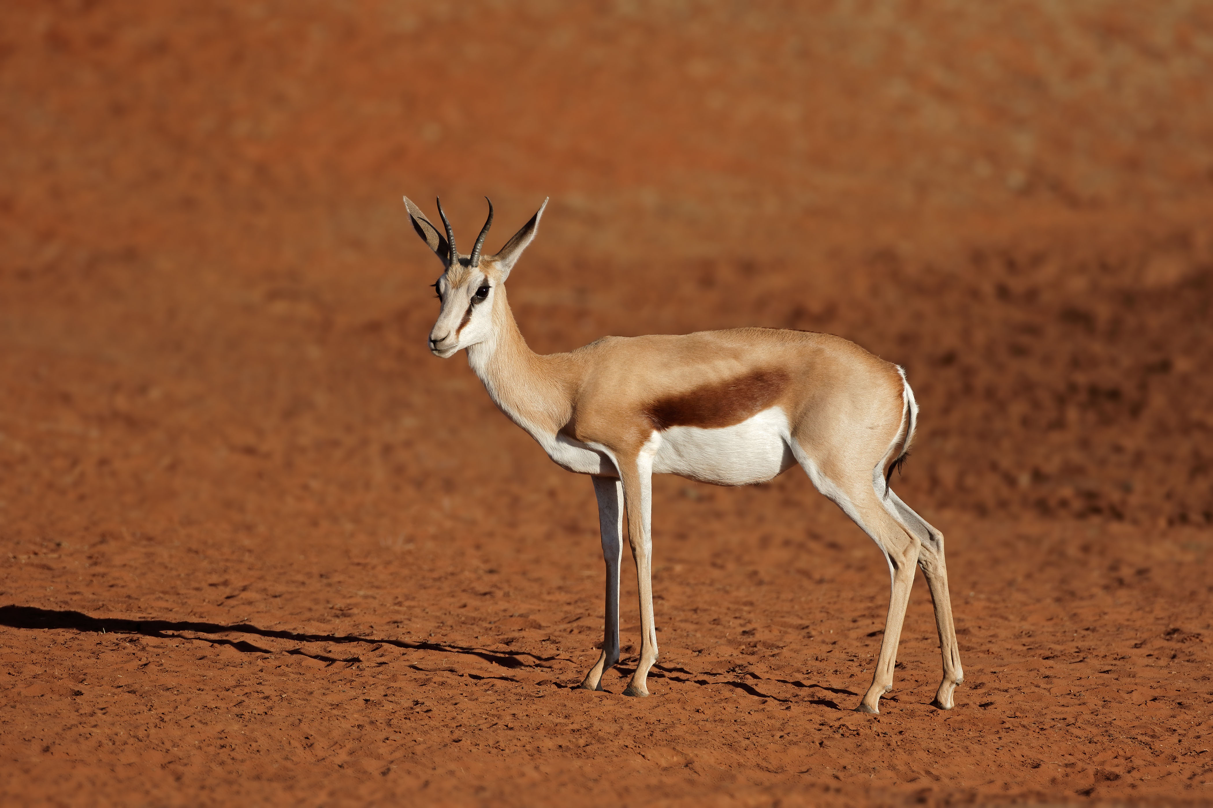 跳羚又名跳山羊,耐旱能力强,以草类和灌木嫩枝为食,能从所食植物中获取足够水分,所以能长期不饮水。天生善跑跳,极善跳跃,跳起时脊背弓起,四肢下伸而靠拢,时速可达94公里,最高可跳3.5米,一次跳跃距离达15米,并且能连续跳跃,它们就是利用这方式来应付它们的头号天敌猎豹。