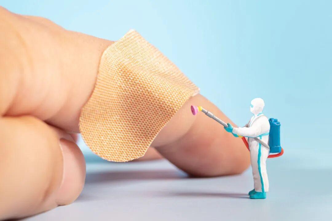 首先,清洁优于消毒,预防感染的关键是有效清洁和清创。大多数常见的伤口都属于急性轻微伤口,例如皮肤擦伤、切割伤,可以及时用大量生理盐水或流动清水(自来水)进行充分冲洗。这样做的目的是清除污染物和细菌等微生物,这是单用消毒剂不能代替的环境。另外,要是有明显的伤口出血,还需要用干净的纱布或布块按压伤口 5 到 10 分钟。大多数小伤口可自行止血。而消毒剂,则主要用于无法彻底清创或感染风险高的伤口,比如容易被污染的暴露部位皮肤。此外,消毒剂的选择也有技巧,因为有的消毒剂对组织有细胞毒性,可能延缓愈合,比如消毒酒精、碘酊、碘酒、过氧化氢(双氧水)、红药水、紫药水……比较好的、作用温和的产品则是聚维酮碘、碘伏、氯己定(醋酸氯己定或葡萄糖酸氯己定),这些产品值得推荐,可以作为居家必备。这类产品的使用,可以参考说明书。