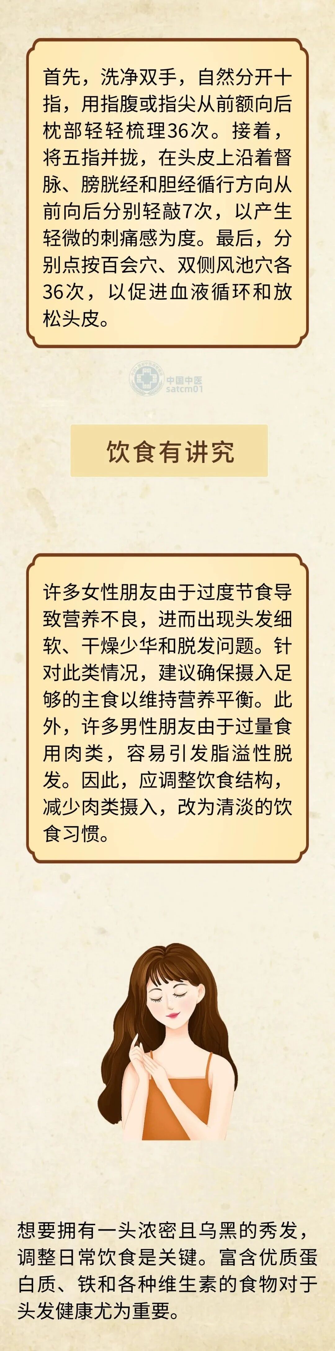 发为血之余,肾其华在发,中医认为头发黑亮浓密关键在于精血充足。《灵枢·阴阳二十五人》说:“血气皆少则无毛,有则稀枯悴。”《诸病源候论》记载:“若血盛则荣于须发,故须发美;若血气衰弱,经脉虚竭,不能荣润,故须发秃落。”《医心方》云:“人有风邪在于头,有偏虚处,则发秃落。”中医认为,精血不足、脉络阻塞是造成脱发的主要原因,当治以益精养血通络。日常生活中应注意以下五点小细节,方可更好地防治脱发。