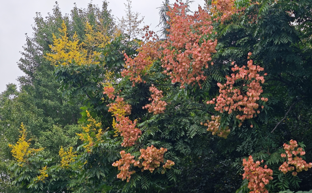 满树“黄金雨”已悄然退场,枝头换上了一串串由粉晕渐变为橙红的蒴果,形如玲珑的“小灯笼”,在秋阳下为园区点亮温柔的光。