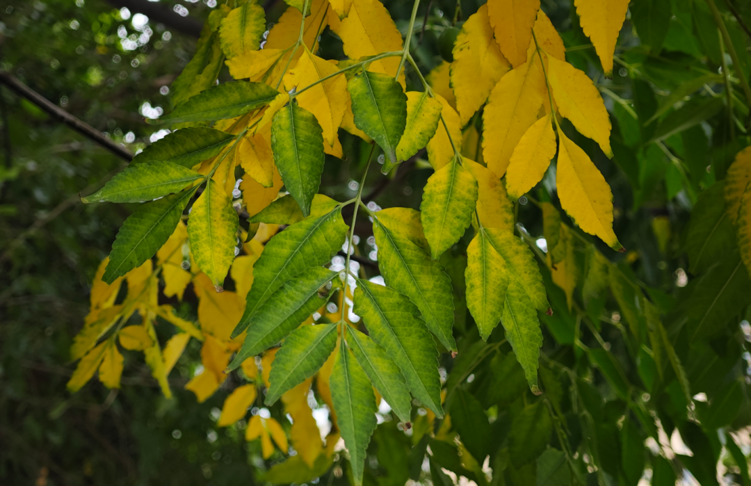 楝树的叶片开始浸染秋意,由绿渐黄;