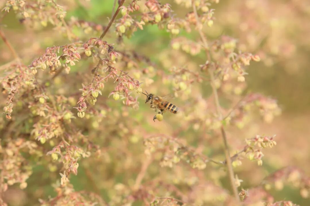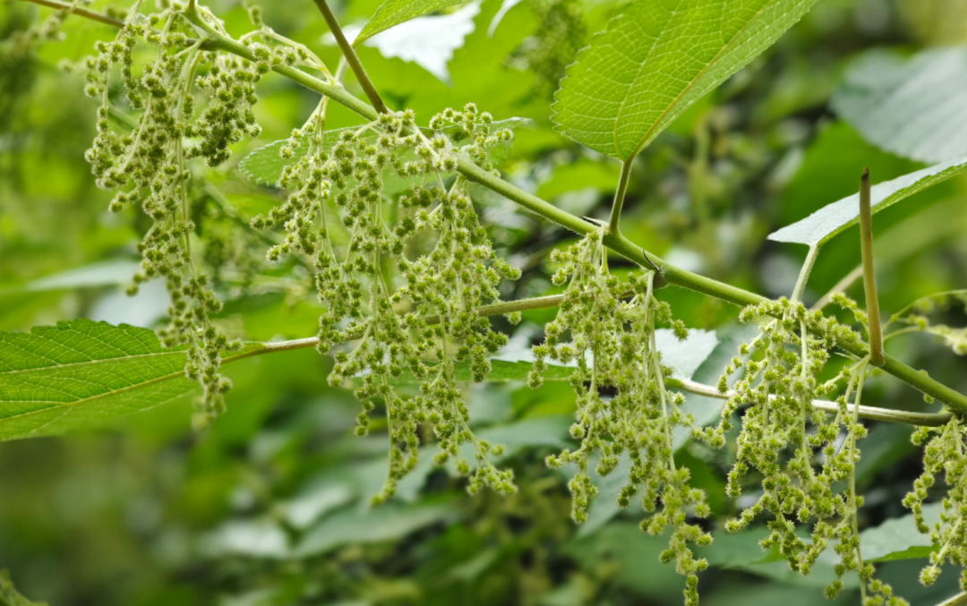雄株花序呈圆锥状,顶生于枝头,黄绿色小花密集排列,花粉量极大。轻轻一碰,便腾起一团“黄色烟雾”,随风飘散,完成授粉使命——也是秋季鼻炎患者的“罪魁祸首”。
