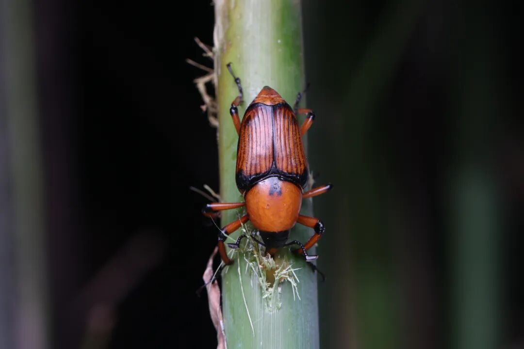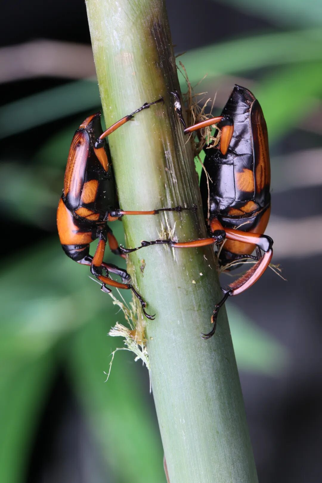 9月初,我们在昆虫调查中记录到一种奇特的身影——大竹象。它出没于高黎贡展区、本土物种保育区及小红山路边的竹丛中,最引人注目的是那根细长如“象鼻”的喙部。它用这根精巧的工具钻入嫩竹笋,不仅取食汁液,更在其中产卵。幼虫孵化后,便在竹腔内悄然发育,与竹共生,静待新生。