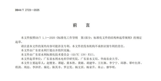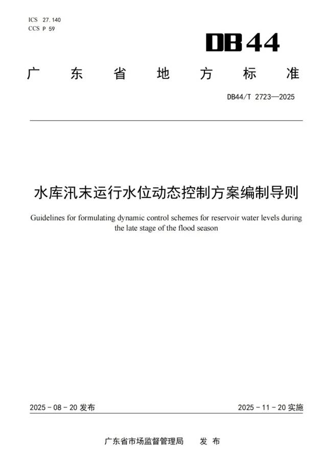 为规范和指导我省大中型水库汛末运行水位动态控制方案编制与技术论证工作,科学利用雨洪资源,提升大中型水库汛末回蓄水平,由我院牵头,联合广东省水文局、华南农业大学等单位编制《水库汛末运行水位动态控制方案编制导则》(DB44/T 2723-2025)(以下简称《导则》),于2025年8月20日获广东省市场监督管理局批准发布,将于2025年11月20日正式实施。