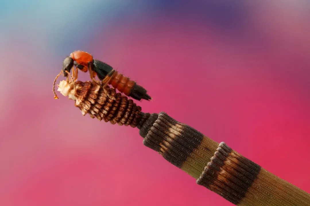 梭毒隐翅虫在外观上很好分辨,细细长长,红黑相间,头尾都是黑色。这种醒目的配色本身就是一种警戒色,向其他生物预警“我有毒,别惹我”。