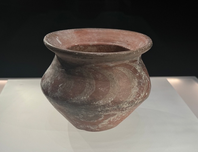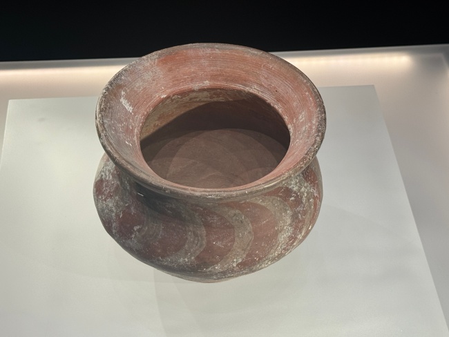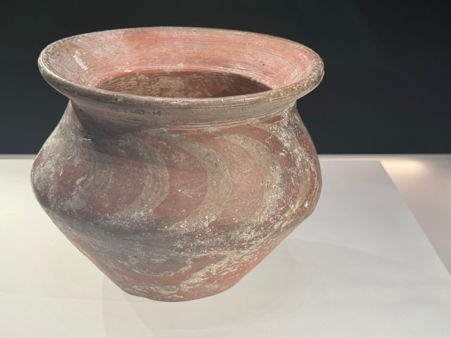 这件彩陶罐真的很“潮”,高11.5厘米,红陶质地,表面光滑得像打了蜡。最绝的是罐身上14枚等距排列的月牙纹,白彩与红陶相映成趣,仿佛先民在陶器上“画”下了一整个月亮周期。