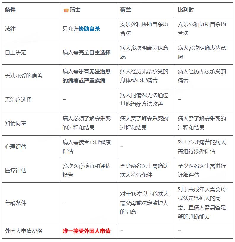 值得注意的是,瑞士自1942年起就允许协助自杀,但禁止积极、直接的安乐死。与荷兰、比利时等国仅限本国公民不同,瑞士接受外国人申请安乐死。