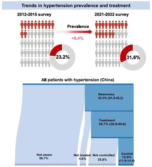 今日是 10 月 8 日,全国高血压日。高血压是全球心脑血管疾病最重要的危险因素之一,在中国,其负担更是持续攀升。一项由中国医学科学院阜外医院王增武团队发表在《细胞》(Cell)子刊上的论文显示:中国成年人高血压患病率持续上升,2021-2022 年患病率为 31.6%,与2012-2015 年相比,增加了8.4%。